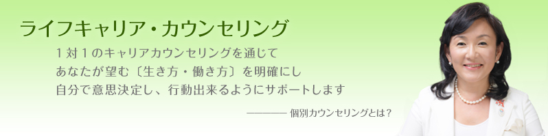 ライフキャリア・カウンセリング1対1のカウンセリングを通じて、あなたが望む〔働き方・生き方〕を明確にし、自分で意思決定し行動できるようサポートします。